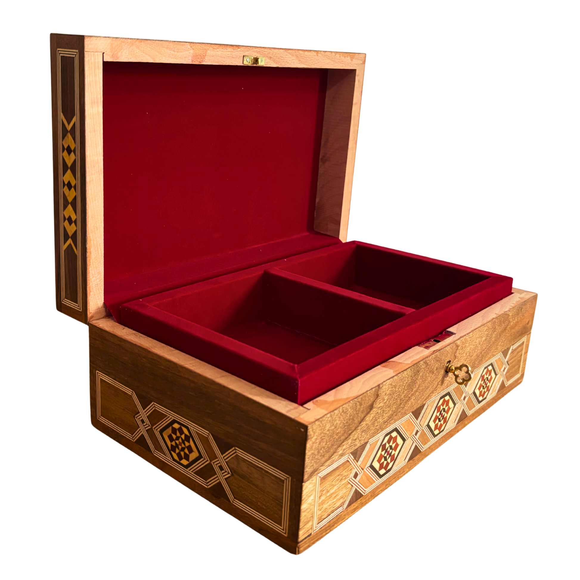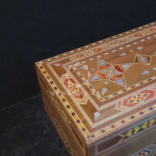 Diese große, handgefertigte damaszener Mosaikschatulle ist ein wahres Kunstwerk, sorgfältig gefertigt aus hochwertigem Rosen-, Eukalyptus-, Buche-, Nussbaum-, Zitronen- und Gelbkiefernholz und kunstvoll mit schimmerndem Perlmutt sowie filigranen geometrischen Mustern nach jahrhundertealten Techniken eingelegt. Das mehrstufige Innenleben bietet eine elegante und sichere Aufbewahrung für Schmuck, Uhren, Erinnerungsstücke und kostbare Andenken – alle sicher verschlossen mit klassischem Schloss und Schlüssel.