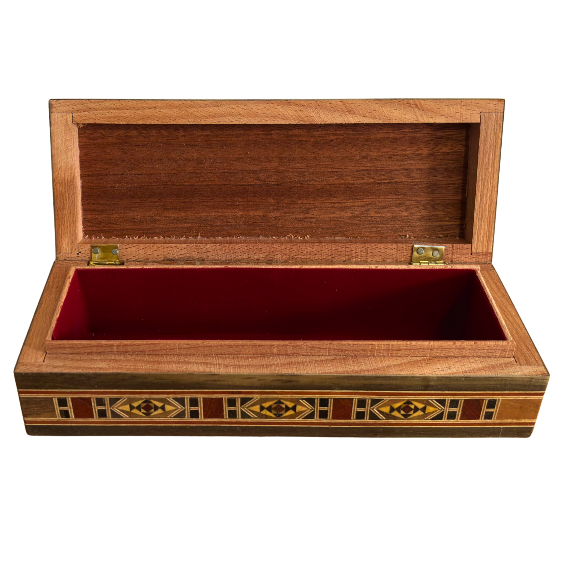 Scatola lunga rettangolare artigianale in mosaico damascato per penne e gioielli, intarsio in madreperla, arte orientale siriana