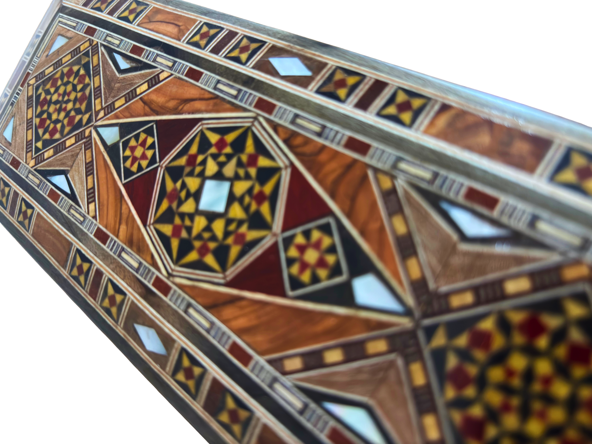 Esalta il tuo spazio con questa splendida scatola in mosaico damascato realizzata a mano, dalla forma allungata e rettangolare, pratica e artistica al tempo stesso. Realizzata con cura da abili artigiani utilizzando legni di noce, faggio, limone e pino giallo, e intarsiata con luminosa madreperla , questa scatola presenta motivi a mosaico geometrici tradizionali ispirati all'arte siriana.