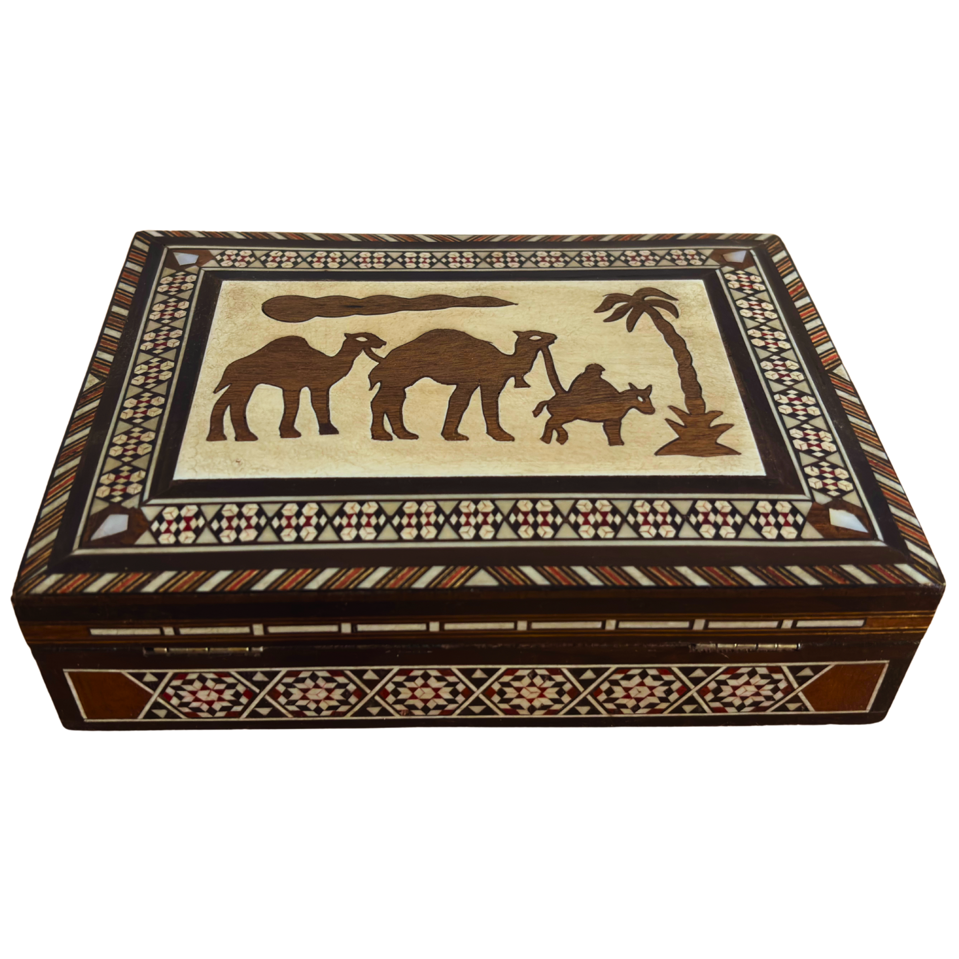 Scatola vintage a mosaico con cammello, scatola in legno damascato del 1970, scatola in madreperla fatta a mano, scena del deserto beduino, ricordo in mosaico siriano, arredamento vintage mediorientale, regalo per lei, regalo di anniversario unico, scatola a mosaico fatta a mano, scatola di Damasco, scatola siriana, regalo per lei, regalo per lui