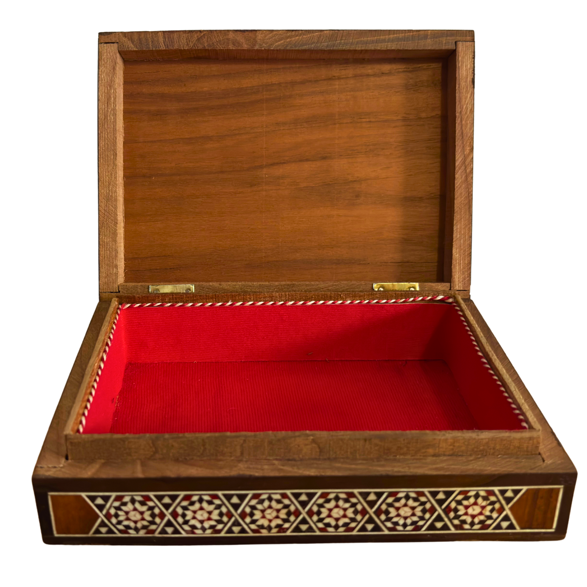 Fate un salto indietro nel tempo con questa scatola vintage in mosaico damascato di medie dimensioni del 1970 , che sfoggia una squisita maestria artigianale tradizionale. Realizzata in legno di noce, faggio, limone e pino giallo, il coperchio presenta un intarsio dettagliato raffigurante due cammelli guidati da un beduino a dorso d'asino , accompagnati da una graziosa palma da dattero. Questo intricato motivo in madreperla cattura lo spirito della vita e della tradizione del deserto mediorientale.
