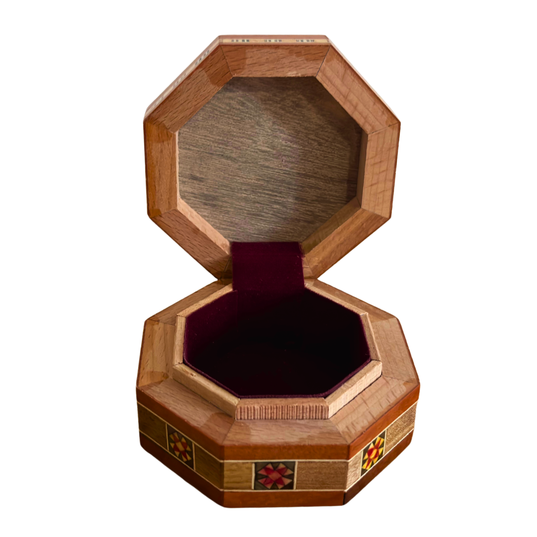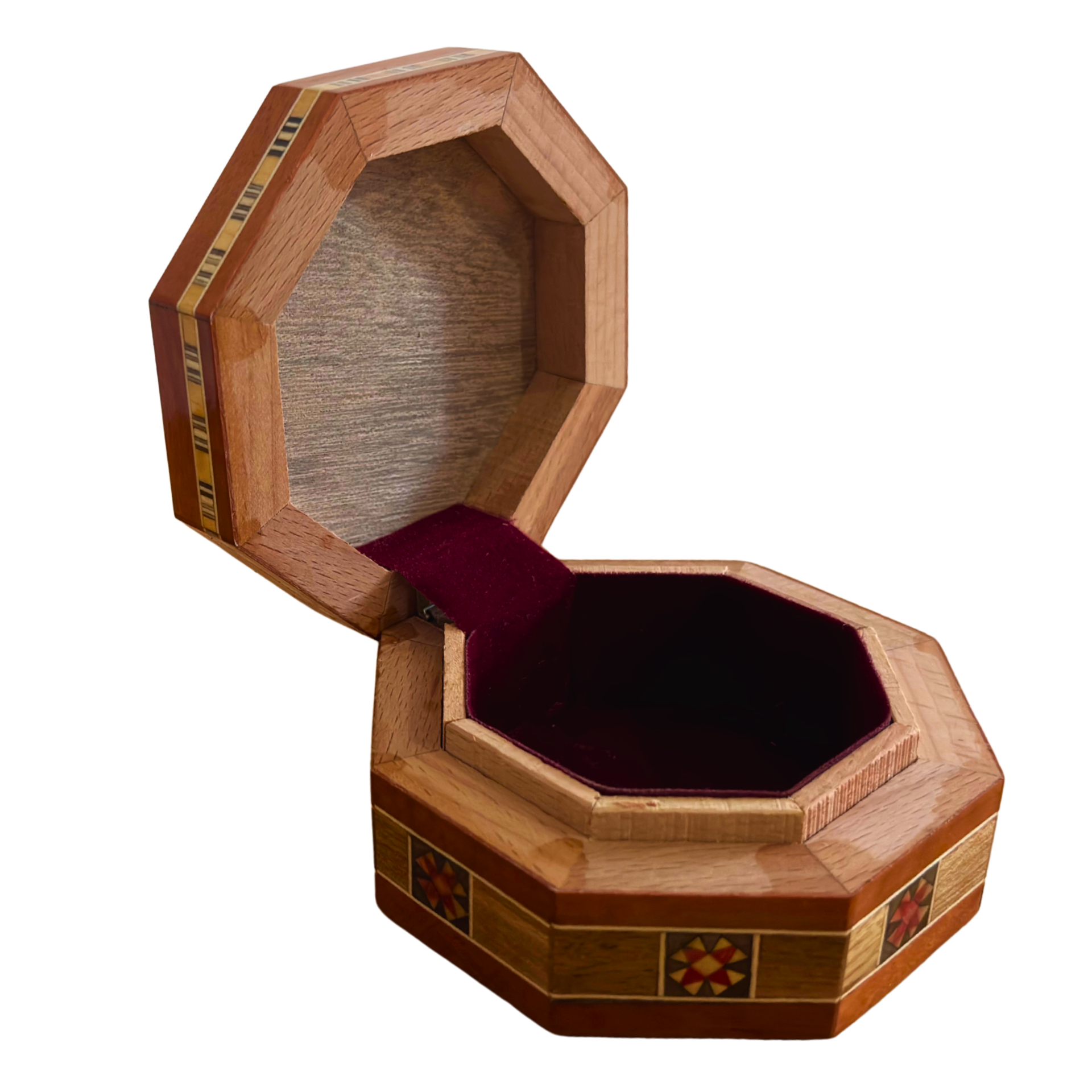 Scatola ottagonale damascata per gioielli – Legno artigianale con intarsi in madreperla in caldo terracotta rustico
