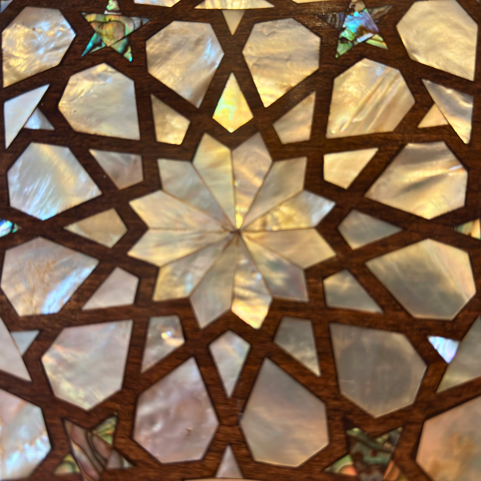 Realizzata in legno di noce pregiato e decorata con intarsi a stella in madreperla, riflette l’arte siriana tradizionale.
