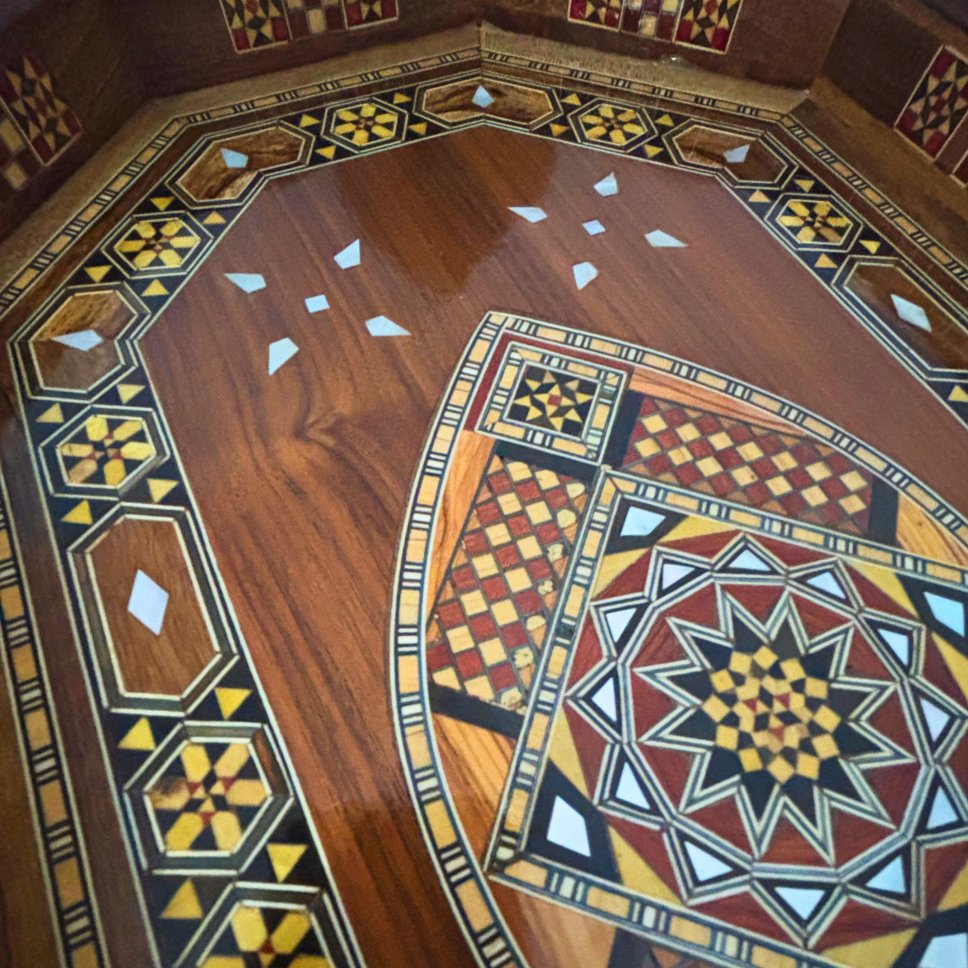 Questo elegante vassoio ottagonale a mosaico rappresenta la bellezza senza tempo dell’arte damascena autentica.