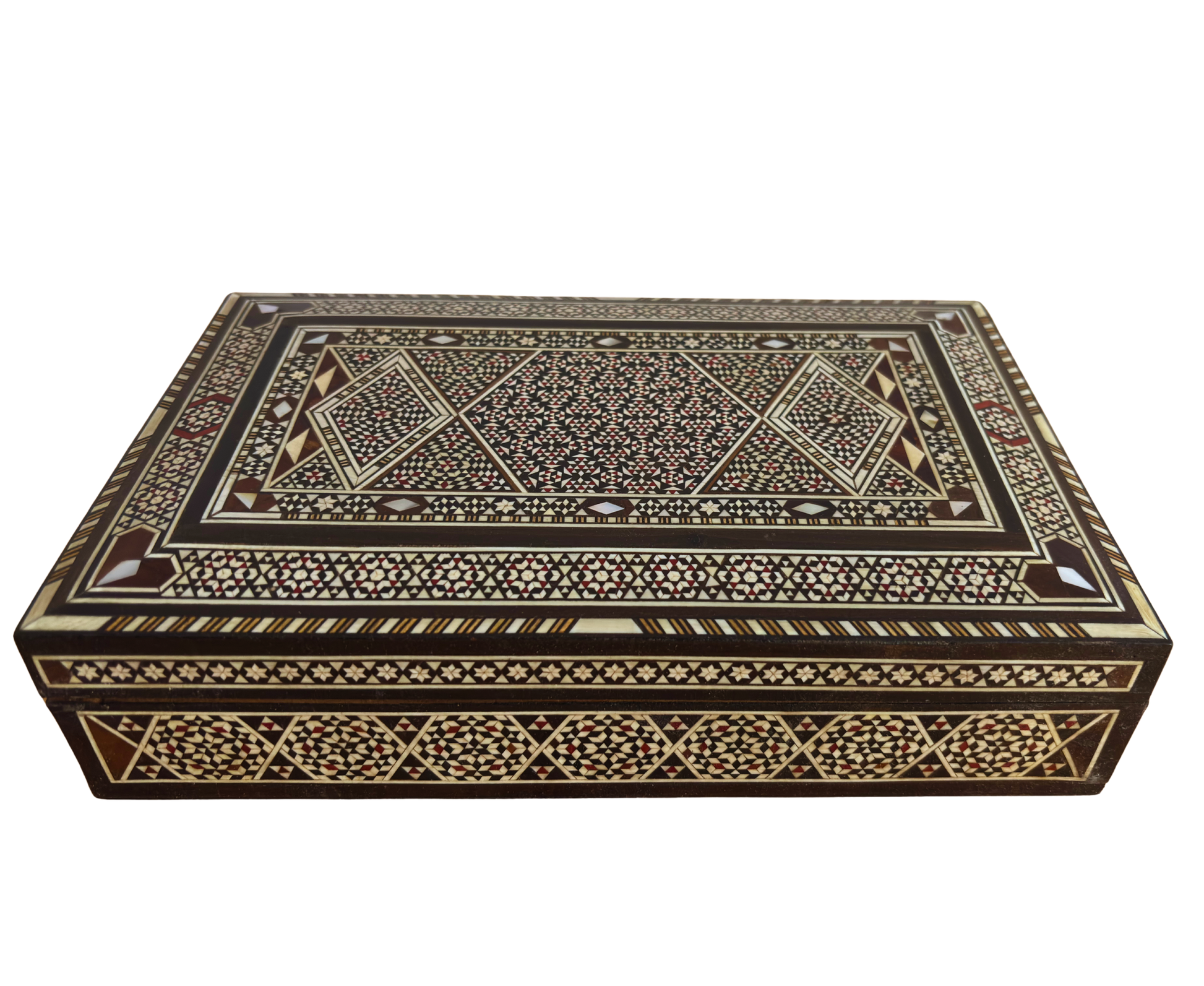 Questo cofanetto vintage in mosaico damascato, realizzato a mano nel 1970, è un tesoro senza tempo per collezionisti e amanti dell'artigianato di pregio. Squisitamente intarsiato con madreperla autentica, presenta eleganti motivi geometrici ispirati alla tradizionale arte siriana. Realizzato con pregiati legni di noce, faggio, limone e pino giallo, questo portagioie in legno fonde tradizione e bellezza senza tempo.