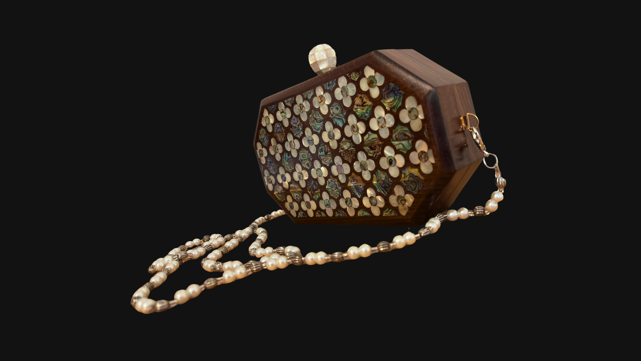 Jouri – Luxe Damascene Clutch met Roze Parelmoer & Parelketting