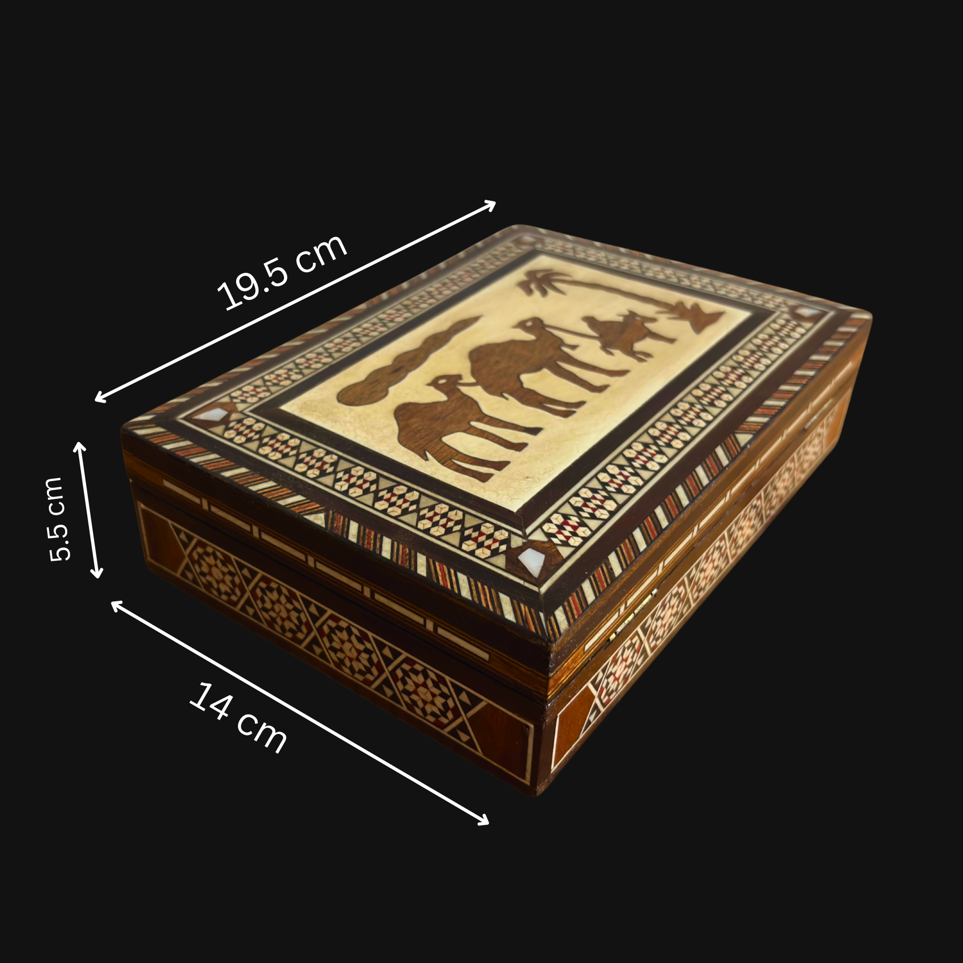 Ga terug in de tijd met deze vintage Damascene mozaïekdoos uit 1970, een prachtig voorbeeld van traditioneel vakmanschap. Gemaakt van walnoot-, beuken-, citroen- en geeldennenhout, toont het deksel een woestijnscène met twee kamelen geleid door een bedoeïen op een ezel, naast een sierlijke dadelpalm. De fijne parelmoerinleg brengt het nomadische leven in het Midden-Oosten tot leven.