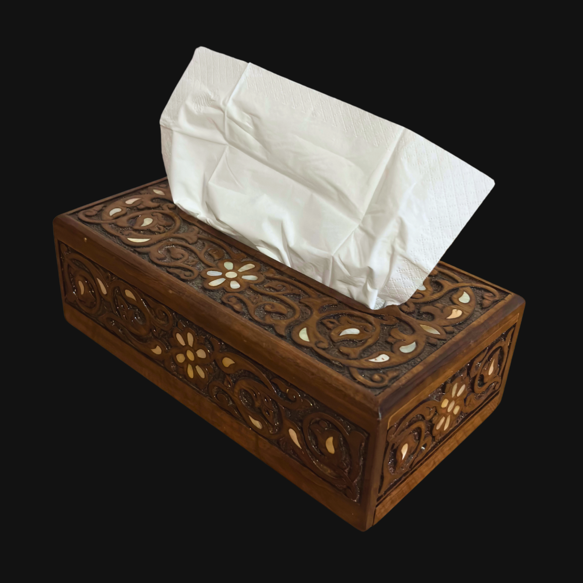 Handgesneden Beukenhouten Tissuedoos – Walnootafwerking met Parelmoer