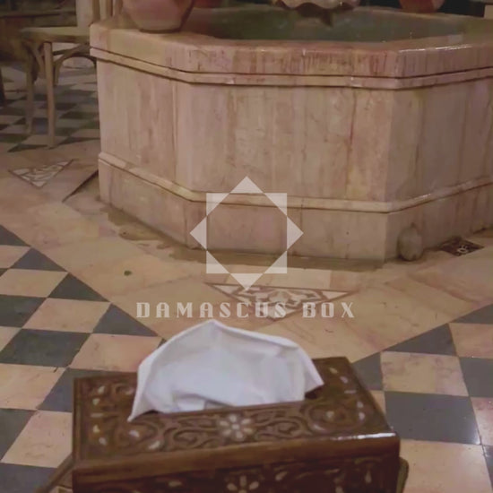 Deze prachtige Damascener tissuedoos is met zorg met de hand gesneden uit gedroogd beukenhout, afgewerkt in een rijke walnoottint, en versierd met 80 stukjes echt parelmoer.