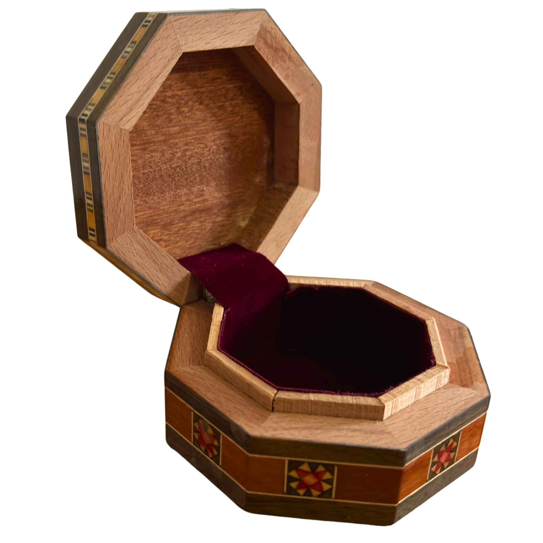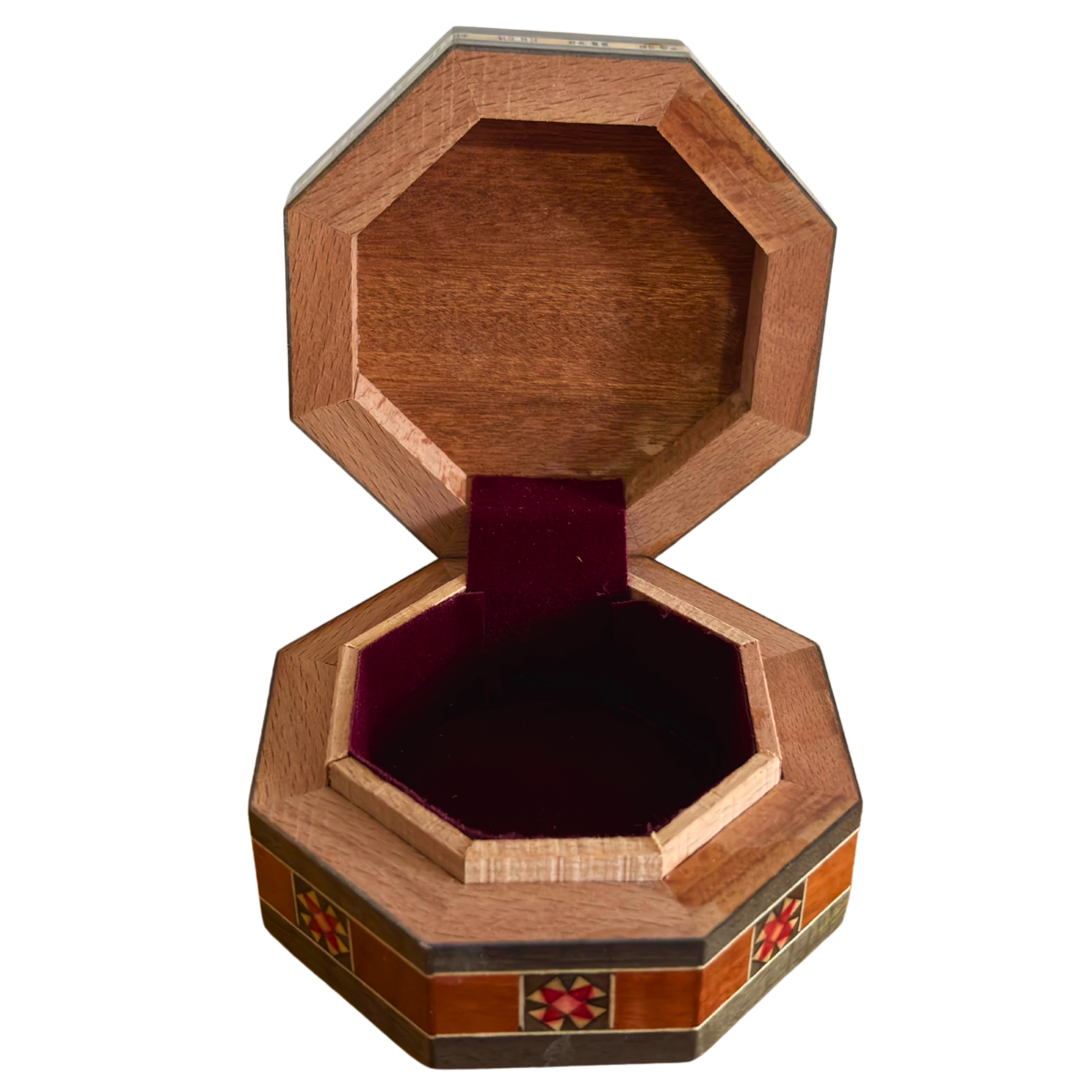 mini ośmiokątne pudełko mozaikowe, ręcznie robione pudełko Damascene, pudełko na biżuterię z masy perłowej, pamiątka Bliskiego Wschodu, pudełko z drewna orzecha włoskiego, unikalny pomysł na prezent, ręcznie wykonane pudełko drewniane, kulturowa sztuka mozaikowa, pudełko z Damaszku, pudełko syryjskie, prezent dla niej, prezent dla niego