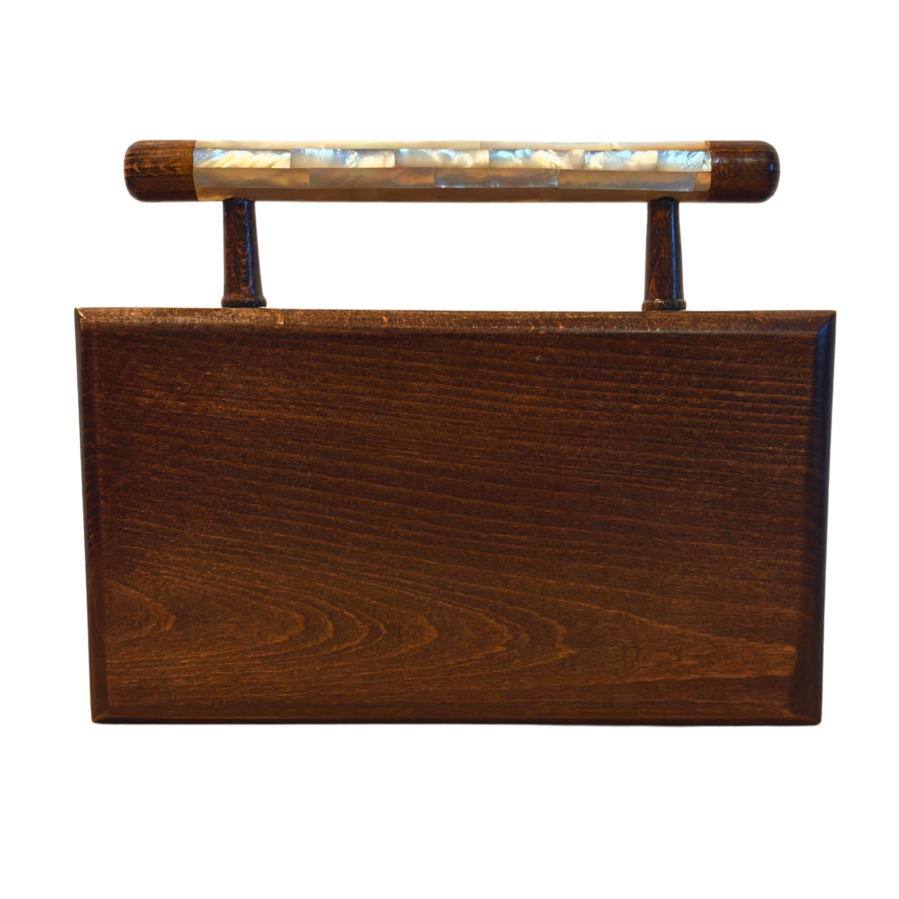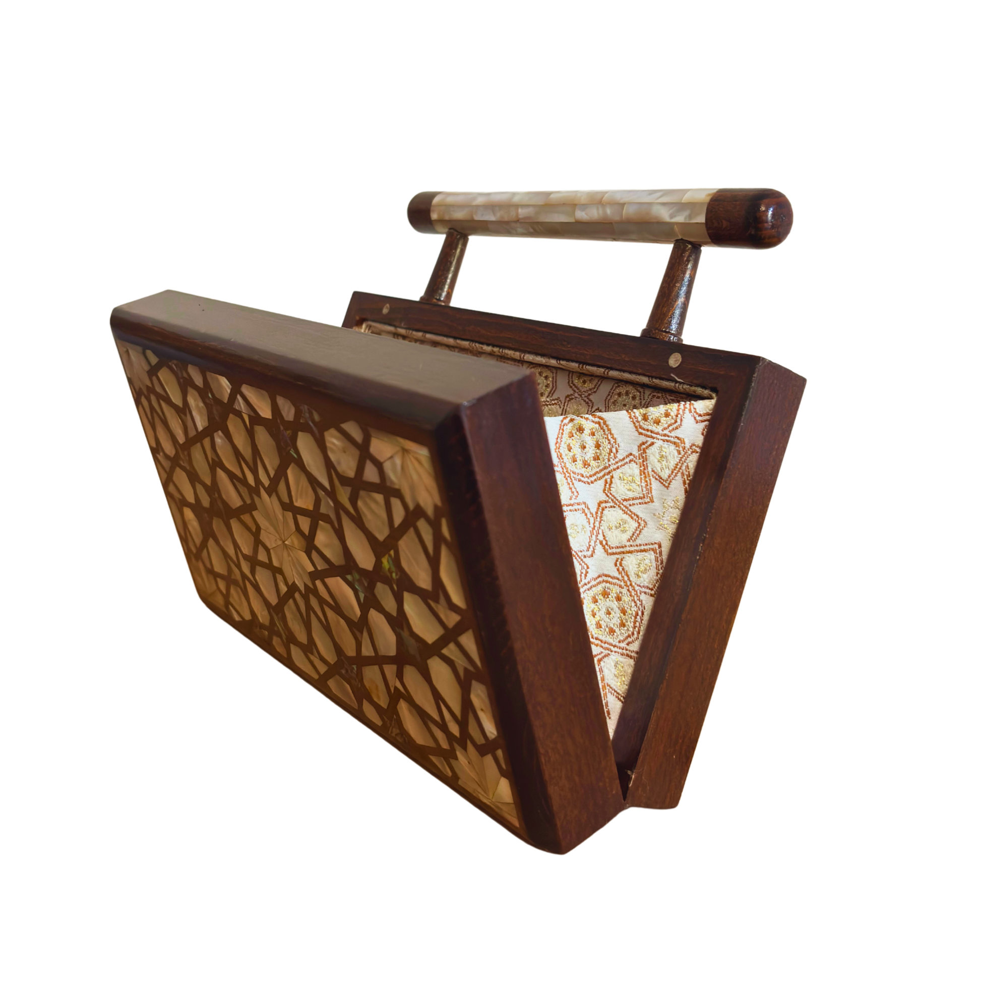 Damascene clutch, mother of pearl inlay, walnut wood handbag, oriental fashion, brocade interior, luxury handcrafted bag, Syrian artistry, Damascus Box