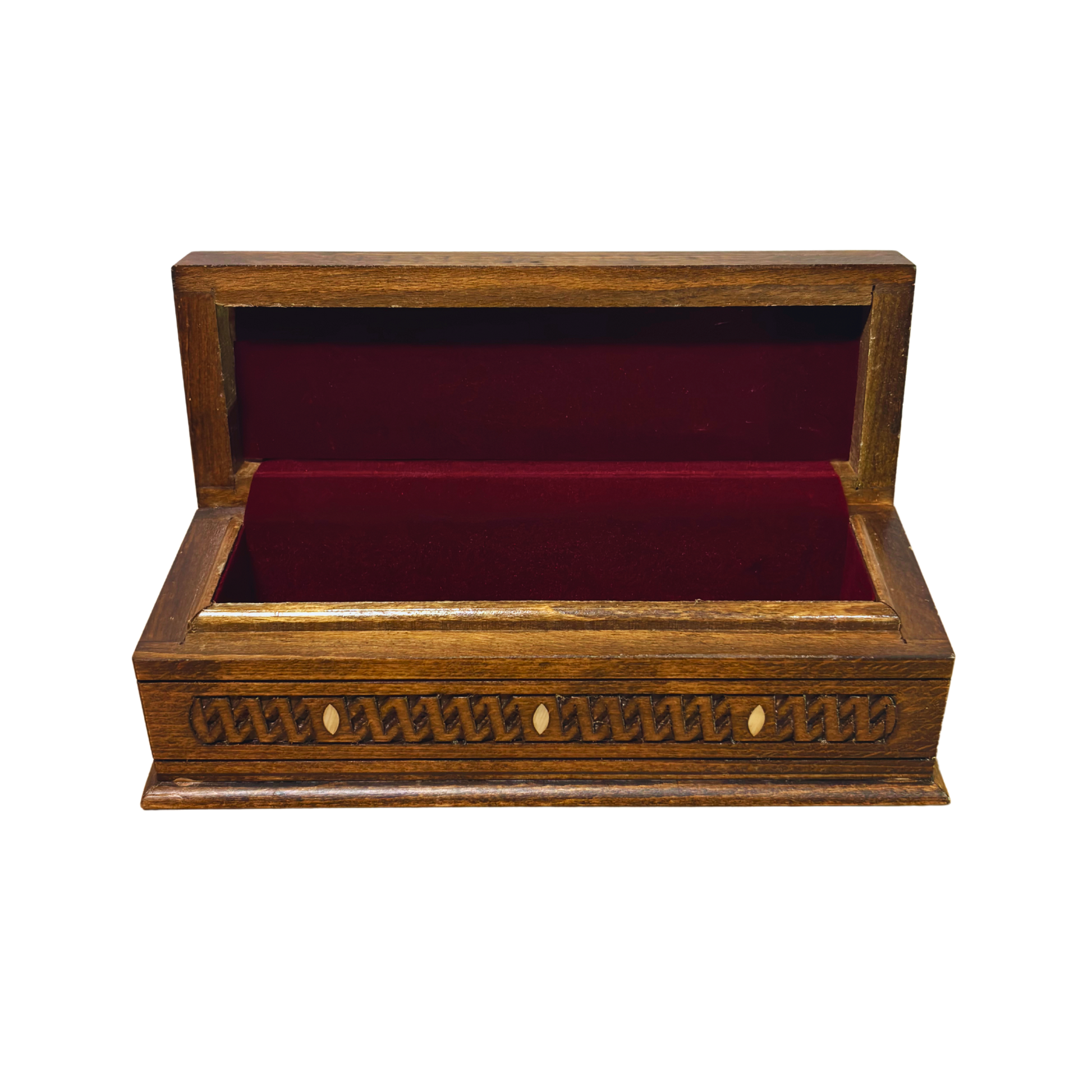 Finished in a dark walnut tone, the surface enhances the richness of the carving while highlighting the natural warmth of the wood. The interior is lined with luxurious wine-red velvet, offering refined protection for jewelry, pens, rosaries, and other cherished personal items.