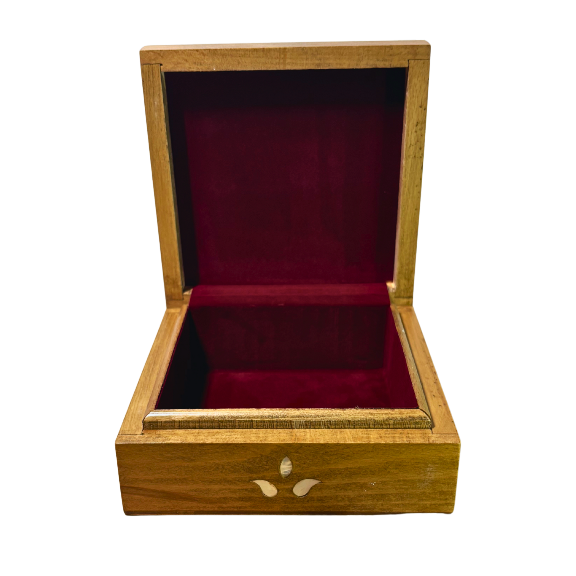Handcrafted with a light walnut finish and adorned with authentic mother of pearl inlay, the box showcases extraordinary craftsmanship and timeless elegance. The interior is lined with luxurious wine-red velvet, offering both beauty and protection for your treasured pieces.