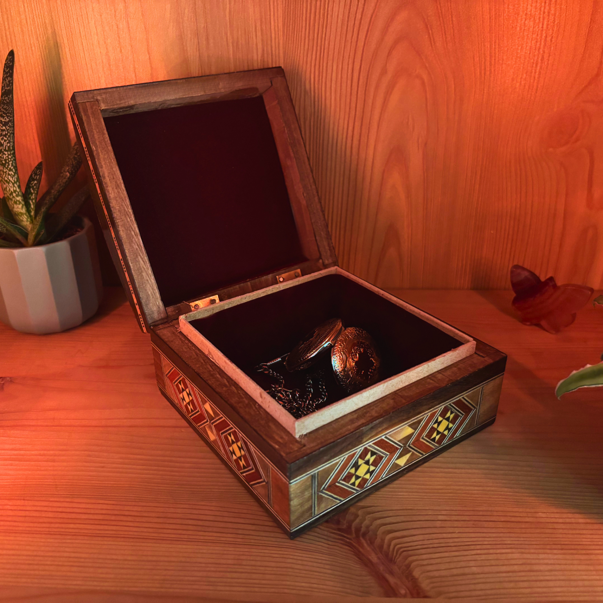 small mosaic jewelry box, handcrafted wood box, Damascene inlay box, oriental keepsake box, wooden trinket box, square wooden gift, Arabic mosaic box, Syrian handicraft, unique Christmas gift, artisan Valentine’s Day box, Damascus box, Syrian box, gift for her, gift for him