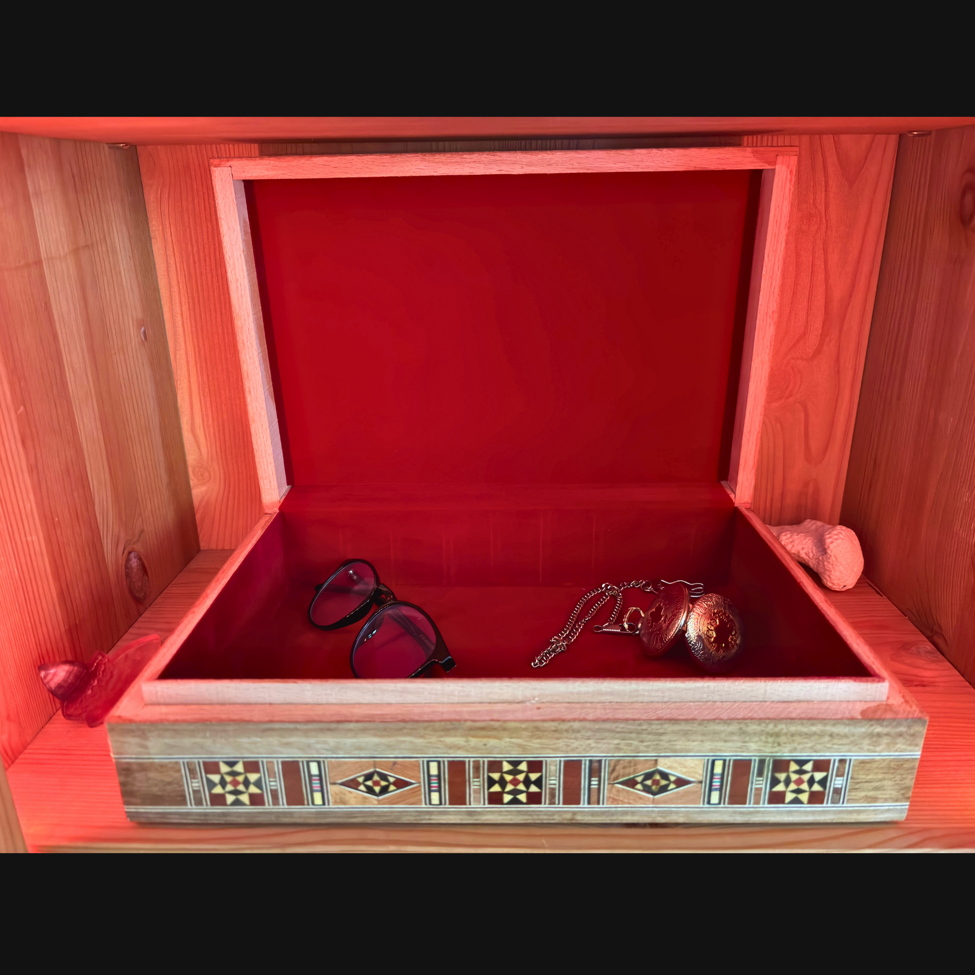 Experience the elegance of traditional Damascus craftsmanship with this large rectangular mosaic box, meticulously handmade from premium Eucalyptus, walnut, lemon, Rose and beechwood. Designed for those who appreciate refined artistry and timeless design, this box is perfect for safely storing jewelry, watches, cigars, delicate keepsakes, or treasured mementos.