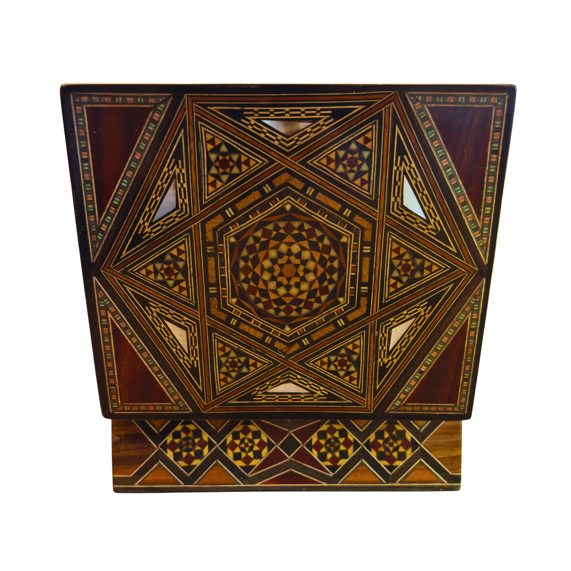 This refined Damascene mosaic box is a testament to the timeless mastery of Gaby Al Dayeh, the legendary 90-year-old artisan honored as the icon of Syria’s mosaic heritage.