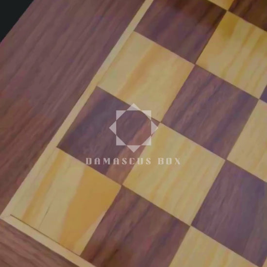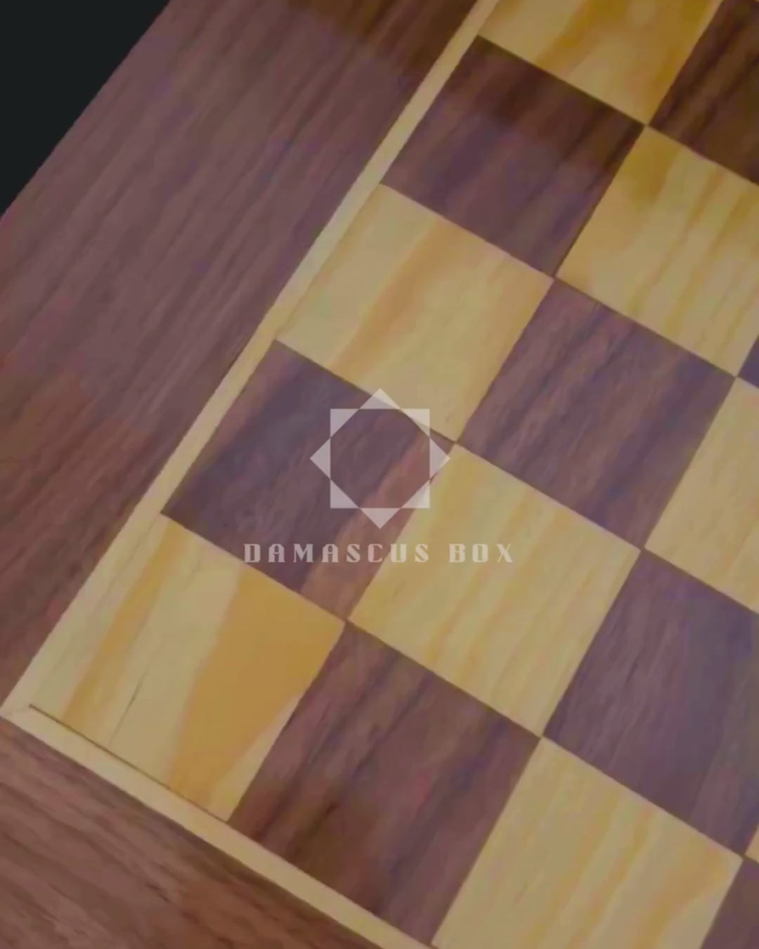 Dış yüzeyde klasik satranç deseni, iç kısmında ise geleneksel Şam mozaiği bulunur. – Suriye sanatının eşsiz bir örneği.